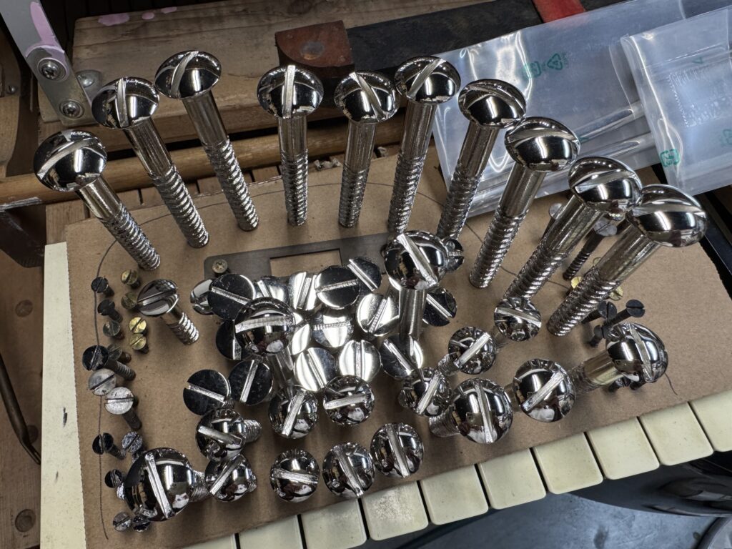 ピアノの内部には多数のネジが使われていて、このような50年以上経過したピアノだとほとんどが錆びています。マイナスネジをホームセンターなどで入手することはできませんがピアノの部品問屋にはあります。